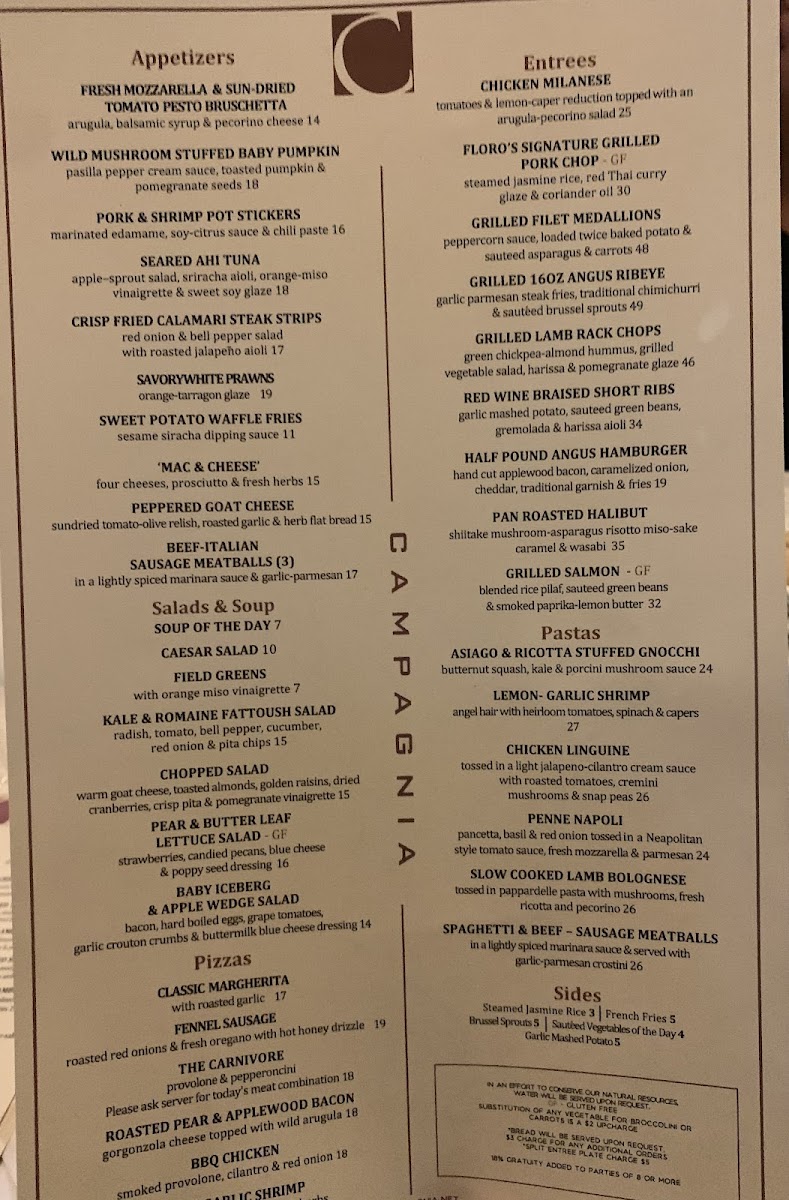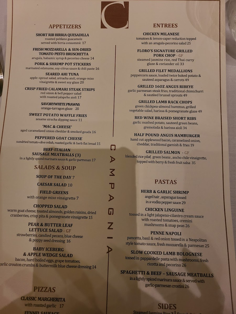 But the culinary experience doesn’t stop there. The entrees at Campagnia Bistro are equally impressive. Savor the Grilled Filet Medallions, perfectly complemented by peppercorn sauce, loaded twice-baked potato, and sautéed asparagus—a dish that exemplifies culinary precision and flavor harmony. Or perhaps indulge in the Grilled Lamb Rack Chops, which come adorned with green chickpea almond hummus, grilled vegetable salad, and a blissful pomegranate glaze that will transport your taste buds to a world of culinary delight.