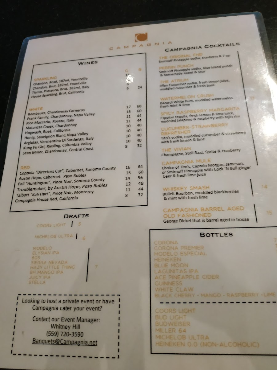 So why not treat yourself to an evening at Campagnia Bistro? With its remarkable menu, lively atmosphere, and dedicated service, it promises an unforgettable dining experience that you will want to relive. Book your table today at +1 559-433-3300, and prepare for an enchanting culinary journey that’s bound to satisfy your palate.